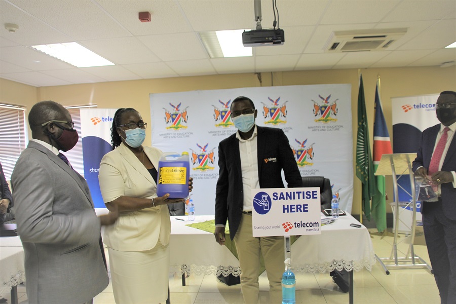 Windhoek, 8 October 2020 – Telecom Namibia handed over Covid-19 mitigating items worth N$100,000 to the Minister of Education, Arts and Culture on Tuesday, 7 October 2020.