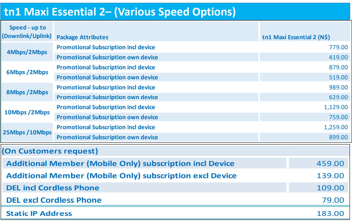 Telecom Namibia tn1 packages offer fixed mobile converged voice, broadband and value added services.