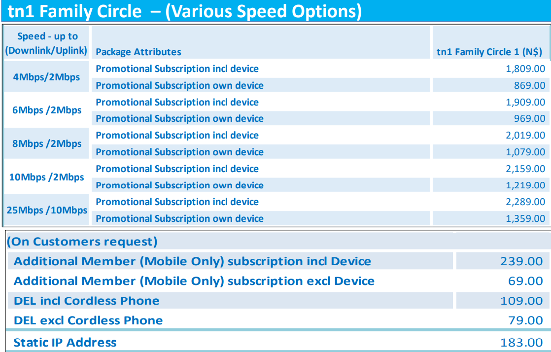 Telecom Namibia tn1 packages offer fixed mobile converged voice, broadband and value added services.