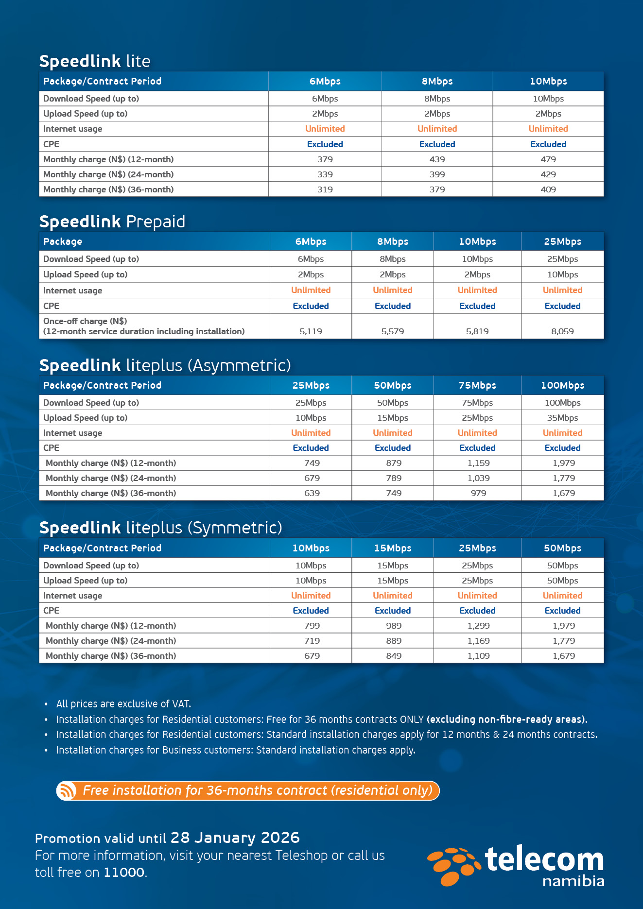 Speedlink Supreme Connect Promotion! Telecom Namibia’s Speedlink Supreme Connect offers more affordable rates on Fiber-powered premium packages, both asymmetric and symmetric, as well as prepaid packages.